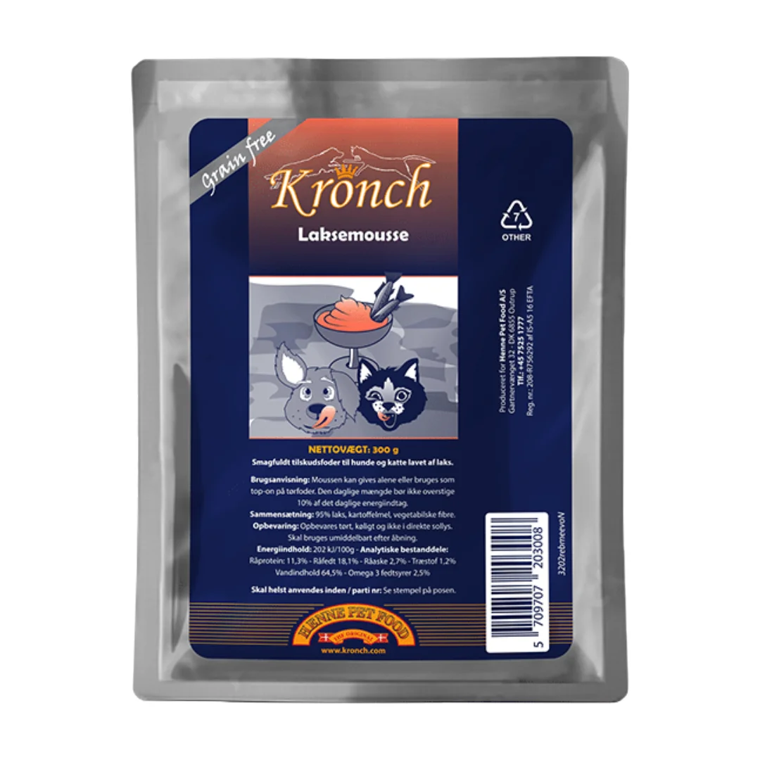 Kronch Laksemousse er et smagfuldt tilskudsfoder til hunde og katte lavet af laks.