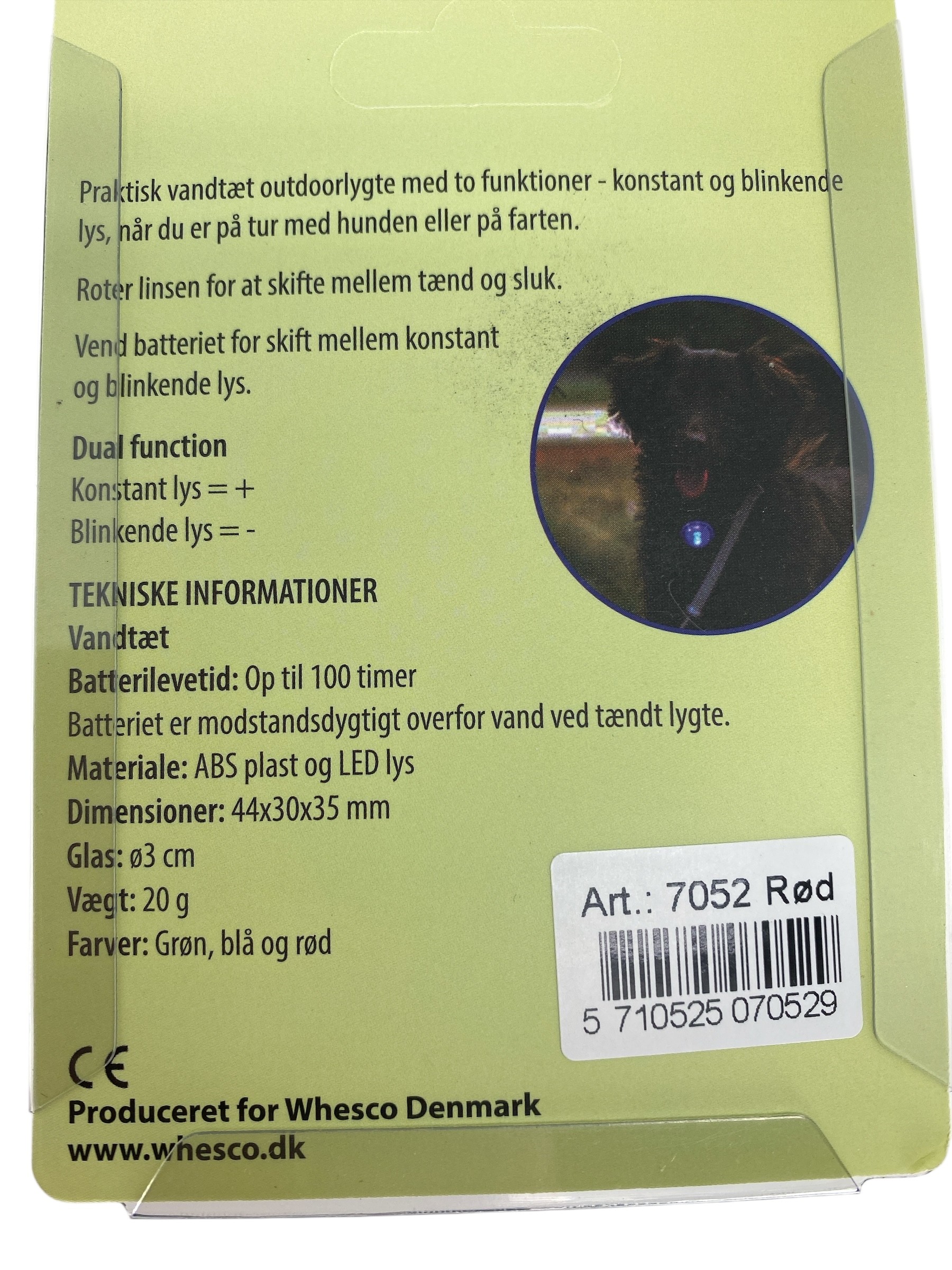 Praktisk vandtæt outdoorlygte med to funktioner – konstant og blinkende lys – når du er på tur med hunden eller på farten.